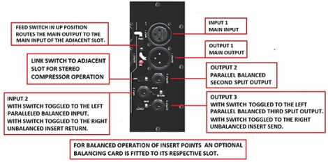 - In active operation (by the use of optional BALANCING CARD) the insert send/return points are converted to balanced. The auxiliary split outputs also become active balanced. (Please note that one Balancing Card is used for each slot. In other words, if you need to upgrade three slots then you will require 3 x Balancing Cards)